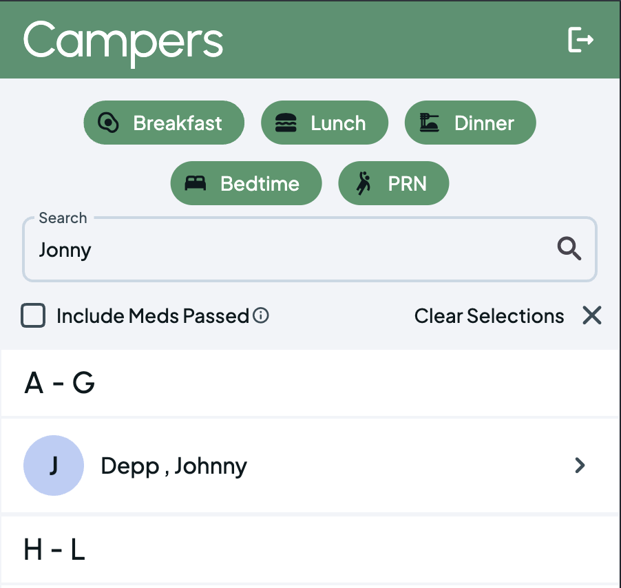 Simply filter the list of campers to see who has to take meds at a given meal. See only the campers who have not already received their medications today, or choose to see them all.