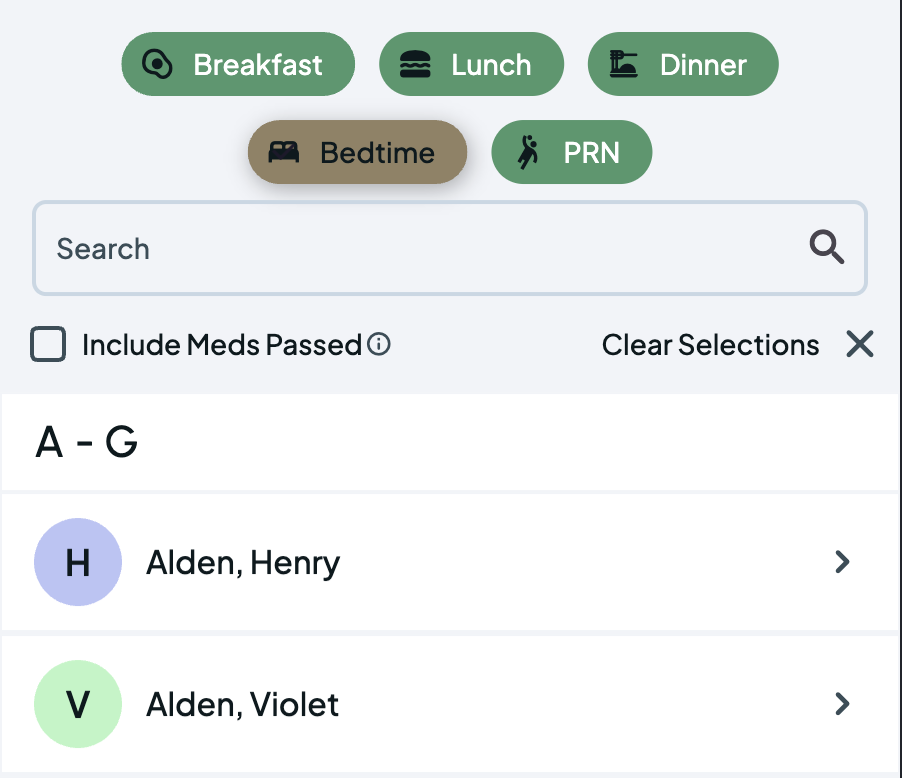 Simply filter the list of campers to see who has to take meds at a given meal. See only the campers who have not already received their medications today, or choose to see them all.